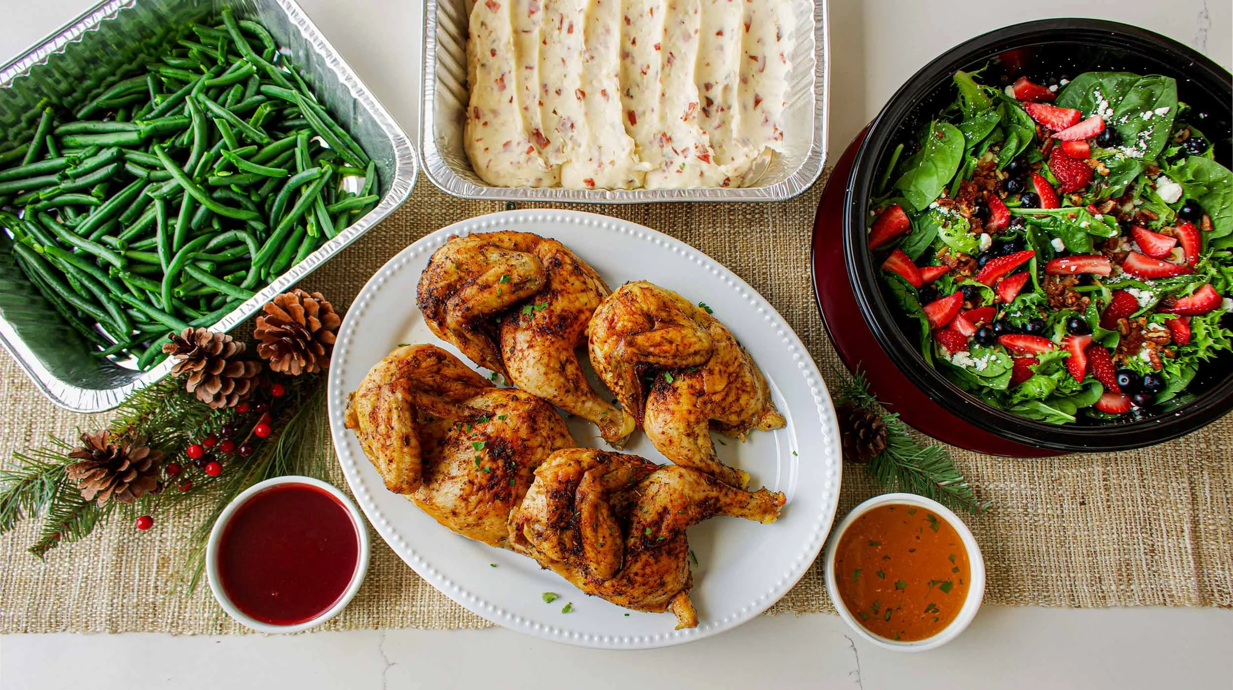 Your seasonal favorites are back for a limited time! Roasted Chicken, perfectly seasoned and slow oven-roasted, served with au jus and cranberry sauce. Scratch-made, warm Bread Pudding served with sweet vanilla cream sauce.
